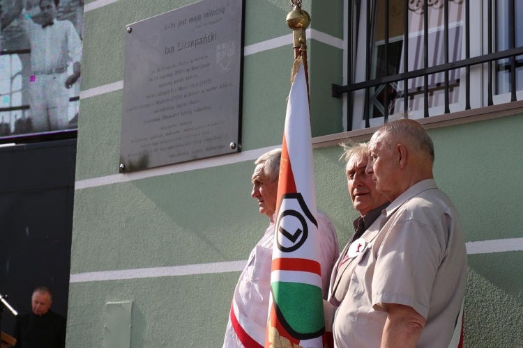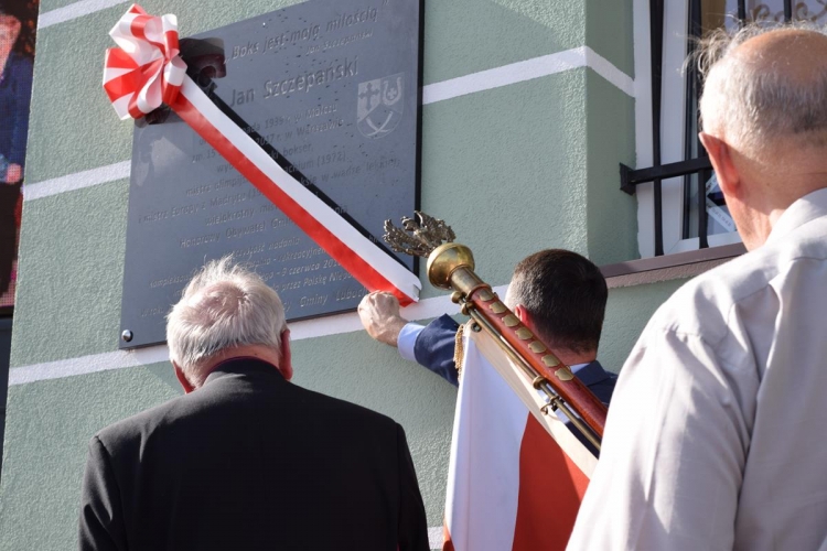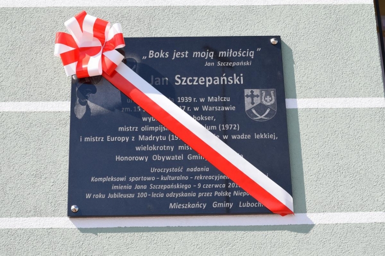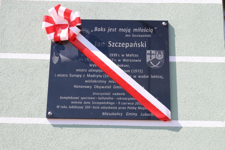 W dalszej części uroczystości miał miejsce kolejny podniosły moment – odsłonięcie ufundowanej przez samorząd i mieszkańców Gminy Lubochnia tablicy pamiątkowej poświęconej  osobie patrona Kompleksu oraz upamiętniającej  to ważne wydarzenie. Odsłonięcia tablicy dokonali: Wiesława Szczepańska – małżonka Jana Szczepańskiego, Dariusz Klimczak – Wicemarszałek Województwa Łódzkiego, Tadeusz Józwik – Wójt Gminy Lubochnia, Tadeusz Skoneczny – Przewodniczący Rady Gminy Lubochnia,  oraz Jerzy Rybicki – mistrz olimpijski oraz wieloletni przyjaciel Jana Szczepańskiego. Uroczystego poświęcenia tablicy pamiątkowej dokonał ks. Tomasz Bojanowski – proboszcz parafii Lubochnia, ks. Stanisław Kuć, były mistrz Europy w boksie w wadze muszej, oraz ks. Mirosław Mikulski – Kapelan Polskich Bokserów, który przyjechał na uroczystość wraz ze sportowcami.